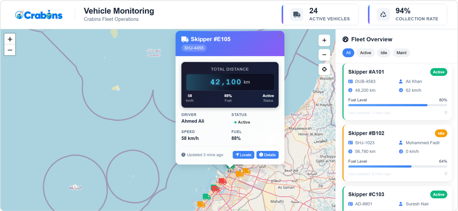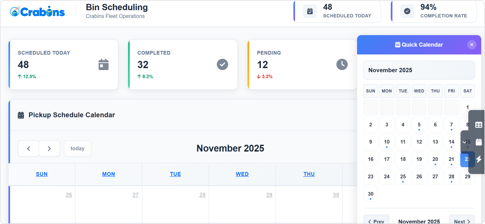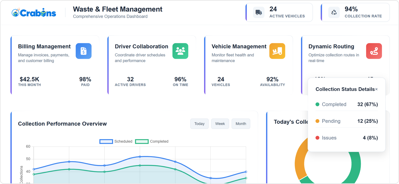 Crabins is more than just waste tracking software; it’s a dedicated partner in streamlining complex waste logistics. We leverage cutting-edge machine learning and real-time data to turn your operations into actionable insights, ensuring every pickup is maximally efficient and cost-effective.